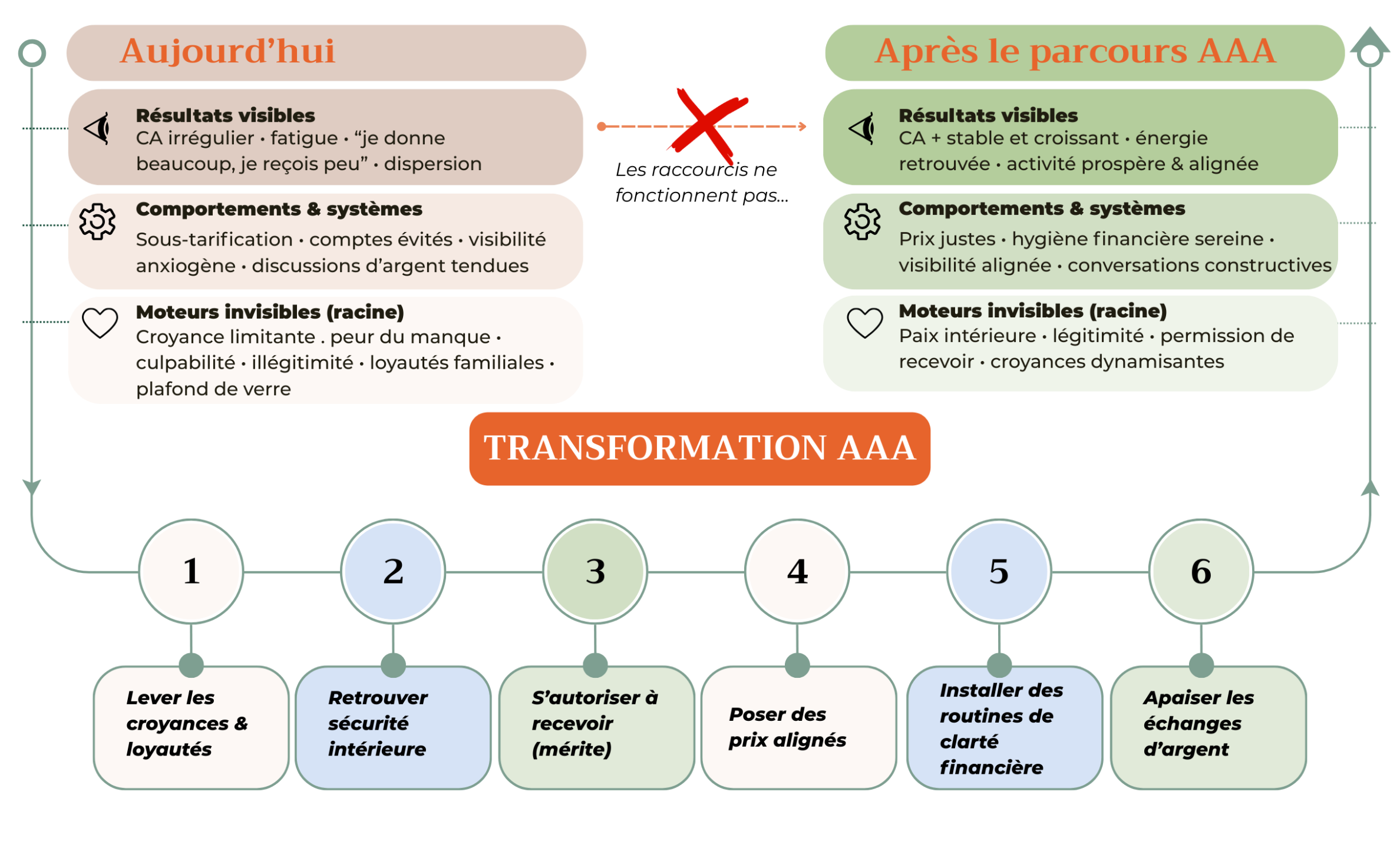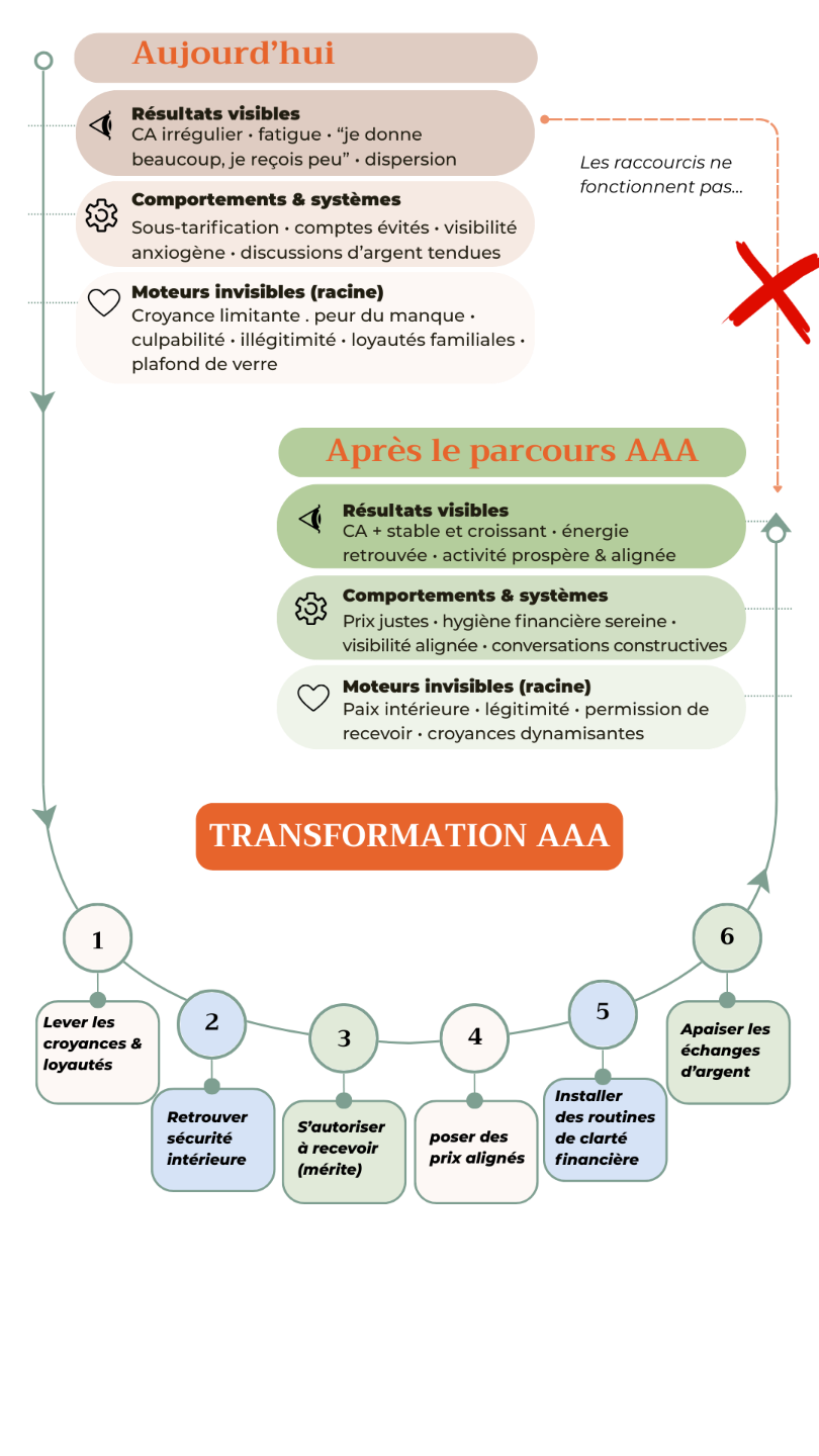 Le parcours AAA m'a apporté une relation beaucoup plus sereine et apaisée vis-à-vis de l'argent. J'ai pu identifier et dégommer une à une les croyances, les projections et les loyautés familiales que j'avais à propos de l'argent. Je n'avais pas imaginé à quel point travailler la thématique de l'argent me permettrait autant d'avancées professionnelles mais aussi personnelles.